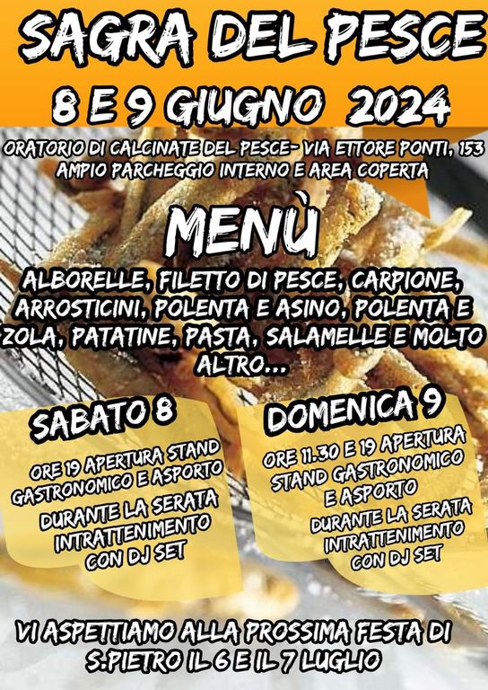 È in programma sabato 8 e domenica 9 giugno la tradizionale "Sagra del pesce" di Calcinate del Pesce, a Varese. All’oratorio di via Ettore Ponti è previsto un ricco menu a base di alborelle e carpione, ma anche polenta e asino, polenta e zola, salamelle, patatine, arrosticini e tanto altro. L'apertura dello stand gastronomico e il servizio d'asporto sarà disponibile sabato 8 giugno dalle ore 19, mentre domenica 9 dalle ore 11 e poi dalle 19. Per entrambe le serate è previsto l'intrattenimento con dj set.
