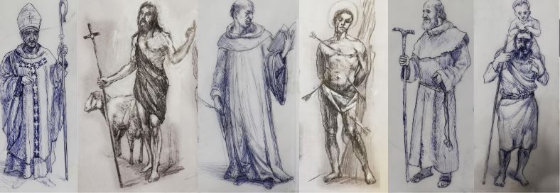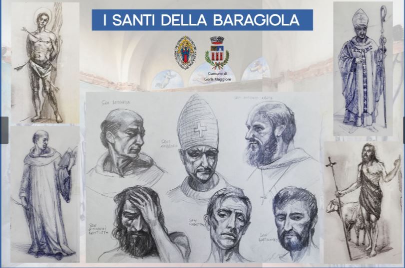La chiesetta in origine era probabilmente affrescata con specifici santi e altri decori, di cui restano solamente alcuni disegni schematici che ricordano come era composta in origine. «Da questi ho attinto – prosegue il pittore - mantenendone sia la sequenza in due distinti gruppi, con la centralità delle pose in piedi e una certa staticità».