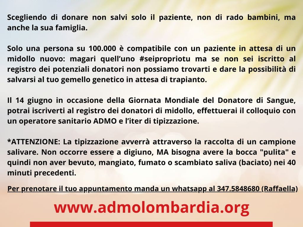 Si parte con l’apertura straordinaria della sede Avis in via Buttafava, dalle 15 alle 17.30. In collaborazione con Admo, sarà possibile effettuare la tipizzazione salivare, prelievo che consente di comprendere il grado di compatibilità tra potenziali donatori e pazienti in attesa di midollo, matching fondamentale in vista di un eventuale intervento (la fascia d’età per iscriversi ad Admo è quella tra 18 e 36 anni non compiuti). «Da tempo – ricorda il vicepresidente Avis, Marco Garbin – collaboriamo con Admo per accrescere il numero dei reciproci iscritti e per promuovere la cultura del dono che ci accomuna, di cui abbiamo bisogno come associazioni e che è preziosa per la popolazione».