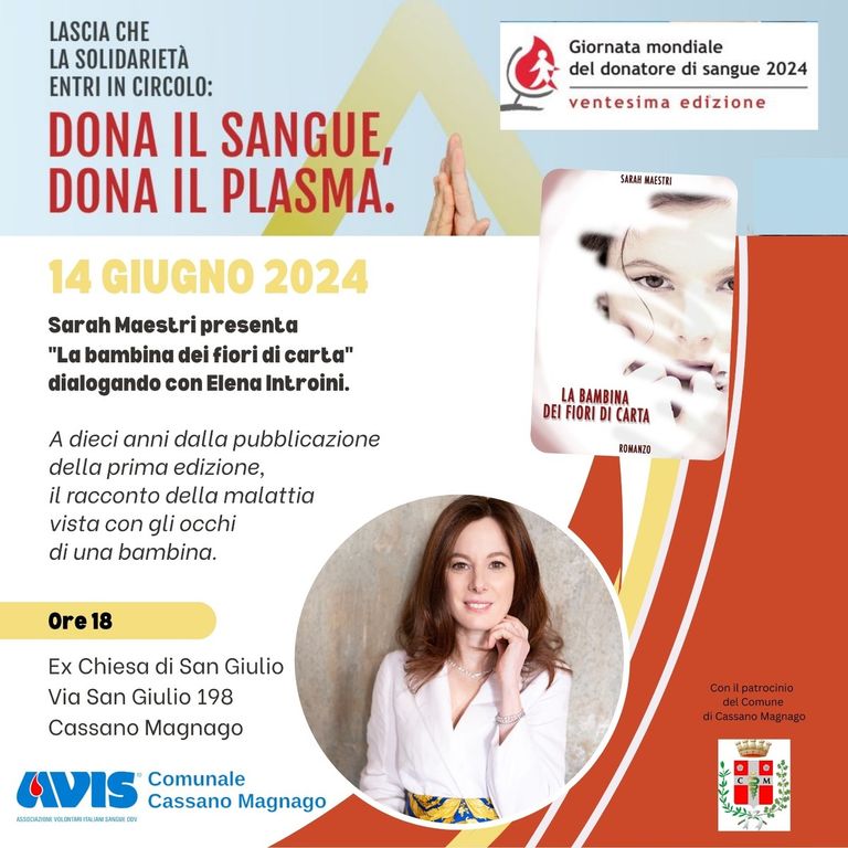 Alle 18, nella ex chiesa di San Giulio, l’attrice Sarah Maestri presenta “La bambina dei fiori di carta”, il libro autobiografico dedicato alla sua infanzia e all’esperienza vissuta in diversi ospedali a causa di una grave malattia del sangue. «Il libro è uscito anni fa e in tempi più recenti è stata pubblicata una riedizione, aggiornata con il racconto del periodo successivo a quello narrato inizialmente. La sensibilità e l’attenzione al sociale, il percorso affrontato, la necessità di trasfusioni vissuta da bambina fanno di Sarah Maestri una testimonial ideale per Avis, tanto più in un momento speciale come la Giornata Mondiale del Donatore. Modera l’incontro Elena Introini, un’altra amica dell’Associazione».