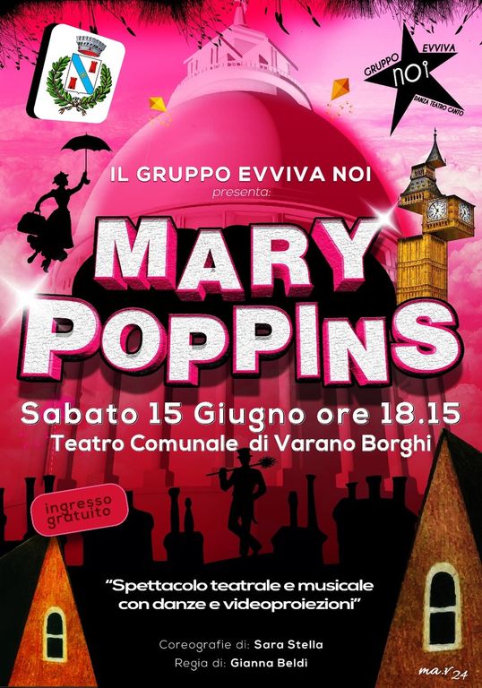 Il Teatro Comunale di Varano Borghi è pronto ad ospitare il saggio di fine anno del gruppo Evviva Noi. Sabato 15 Giugno alle ore 18.15 andrà in scena lo spettacolo teatrale e musicale “Mary Poppins” con danze e videoproiezioni.