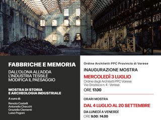 Il 3 luglio, dalle ore 17, l'inaugurazione della mostra “Fabbriche e memoria”. La rassegna sarà ospitata nella sede dell’Ordine degli Architetti di Varese, in via Gradisca.