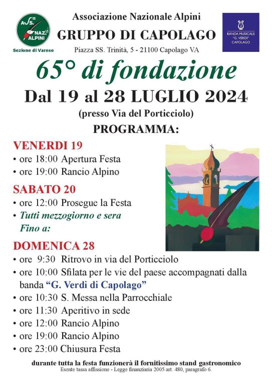 Quest’anno l’iniziativa avrà anche una valenza in più visto che il gruppo Alpini di Capolago festeggia il 65° anniversario della fondazione, che verrà celebrato con una sfilata per le vie del paese con l’accompagnamento della banda Verdi di Capolago il giorno finale della festa, domenica 28 alle ore 10.