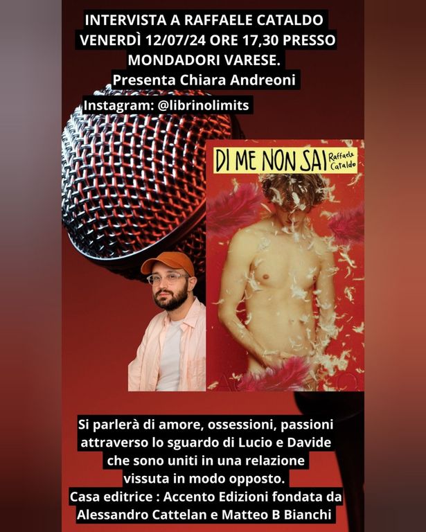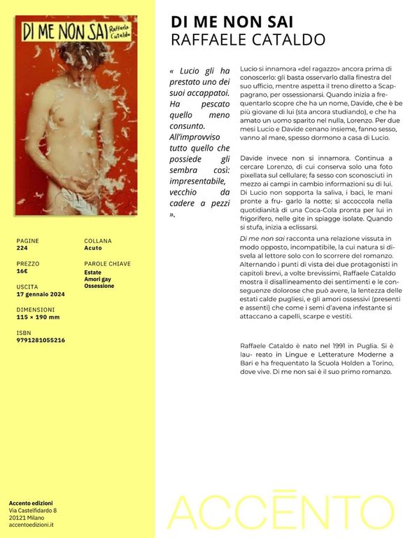 Di me non sai, edito da Accento Edizioni, la casa editrice fondata dal conduttore televisivo Alessandro Cattelan e dallo scrittore Matteo B. Bianchi, verrà presentato venerdì 12 luglio alle 17.30 presso la libreria Mondadori di Varese, in via Morosini 10.
