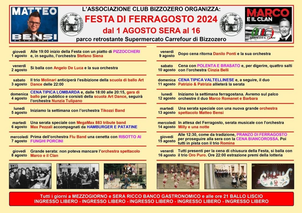 Tanta musica, balli e ricco banco gastronomico alla "Festa di Ferragosto 2024", in programma dalla sera dell'1 al 16 agosto presso il parco situato dietro il supermercato Carrefour, a Bizzozero.