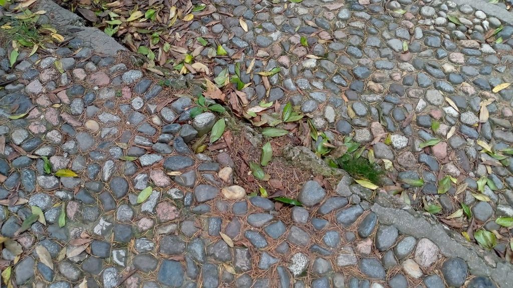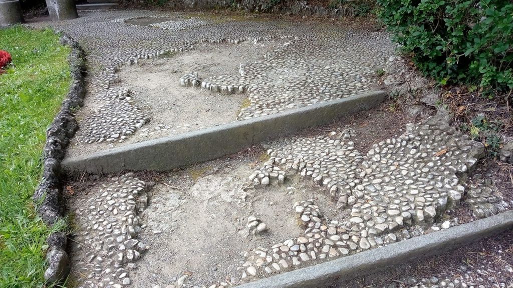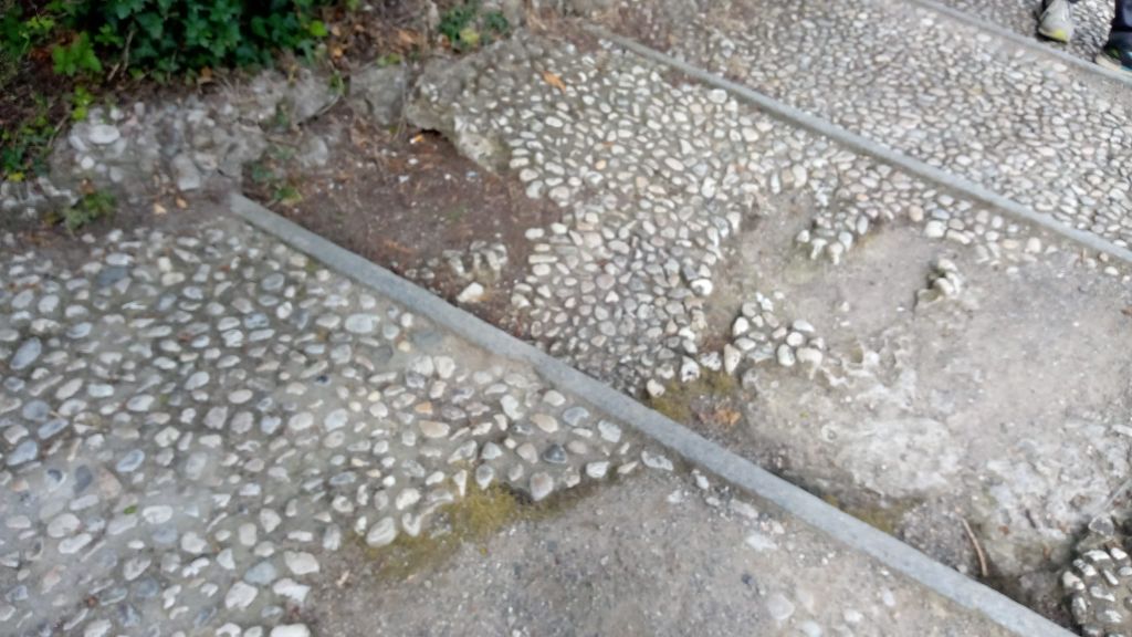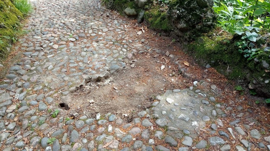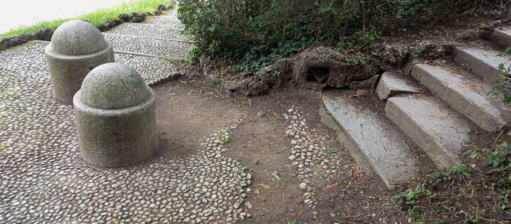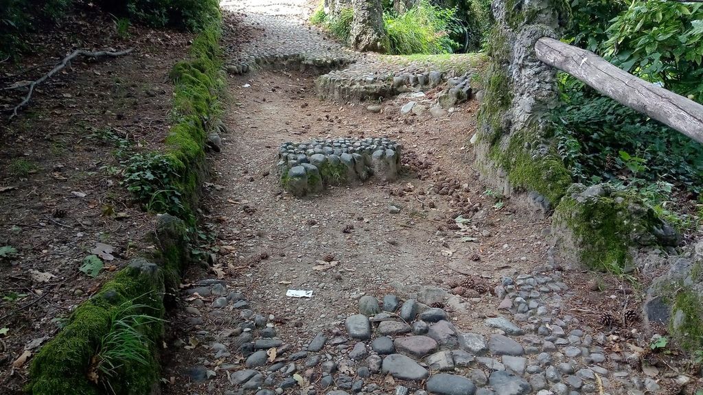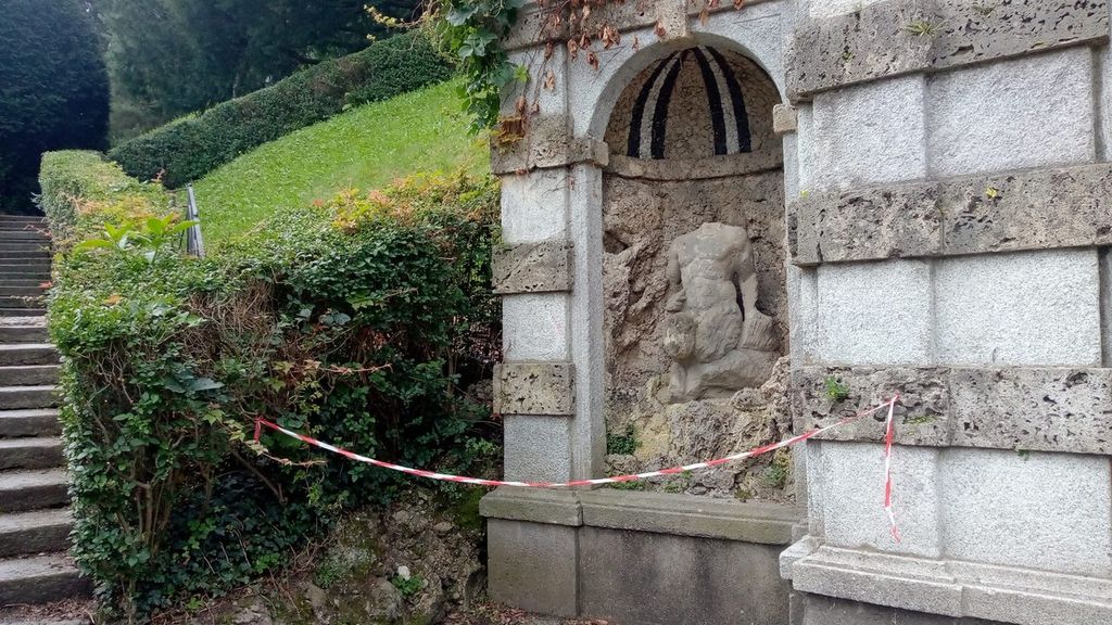 Salendo i gradini vicino alla fontana, si può notare che le pietre che compongono la pavimentazione hanno lasciato spazio ad alcune buche e, proseguendo il Ninfeo, la statua gioiello dei Giardini Estensi, risulta pericolante, come segnala il nastro rifrangente.