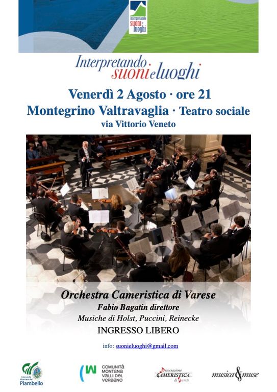 Venerdì 2 agosto, alle ore 21, nel Comune di Montegrino Valtravaglia presso il Teatro Sociale in via Vittorio Veneto si esibirà l’Orchestra Cameristica di Varese con Musiche di Holst, Puccini, Reinecke diretta da Fabio Bagatin.