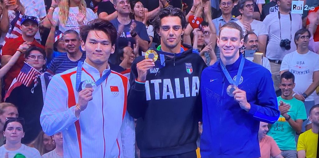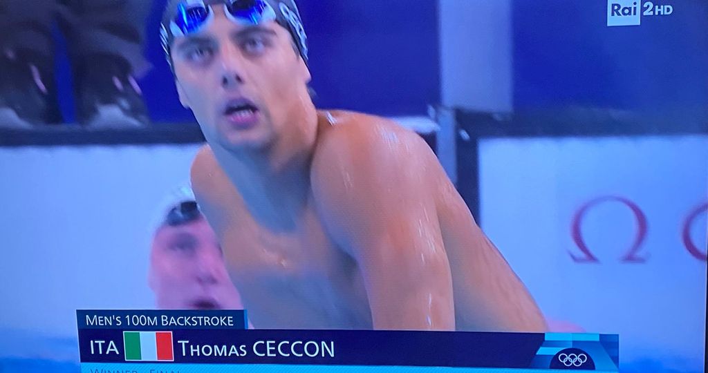 Il cinese Xu Jiayu, lo spauracchio, è secondo dopo una partenza folle, mentre lo statunitense Ryan Murphy è di bronzo. Ma è Ceccon, sguardo duro, assassino e di ghiaccio ad alzare le braccia lassù, trovando idealmente quelle del nostro Martinenghi nell'Olimpo degli dei del nuoto.
