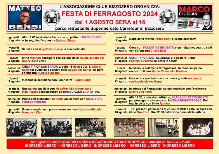 Dall'1 al 16 agosto torna la "Festa di Ferragosto" del Club Bizzozero, la manifestazione benefica che da 50 anni anima Varese nel periodo più caldo dell'anno, con buona cucina e tanta musica popolare.