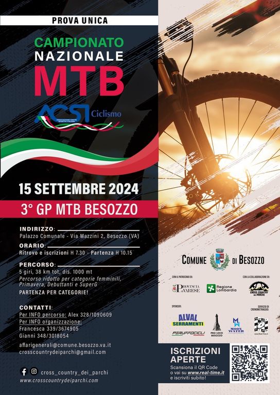 Il Comune di Besozzo (VA) e l' ASD Cross Country dei Parchi saranno pronti ad accogliere, atleti e spettatori il 15 settembre, già a partire dalle h 7,30, per il campionato nazionale ACSI MTB 2024.