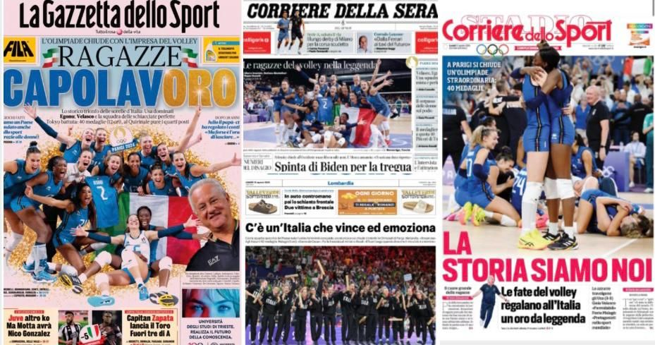 "La storia siamo noi", "Ragazze capolavOro". "C'è un'Italia che vince ed emoziona", "Le ragazze del volley nella leggenda", "L'Italia siete voi": le ragazze del volley, tra le quali la nostra Caterina Bosetti, originaria di Albizzate (leggi QUI), conquistano tutte le prime pagine d'Italia. Meritatamente.
