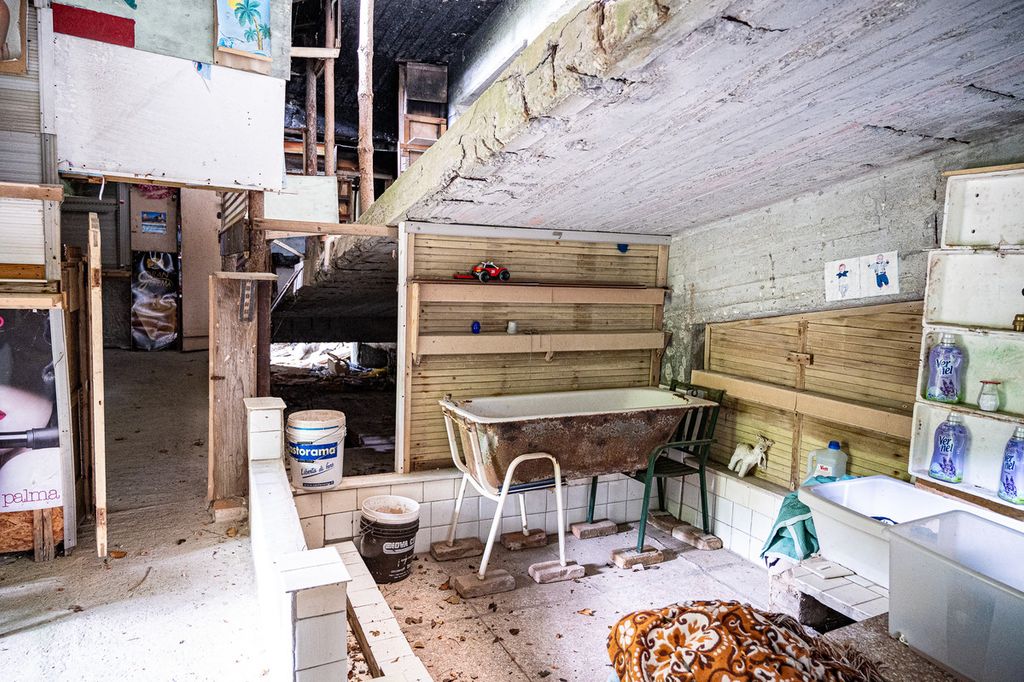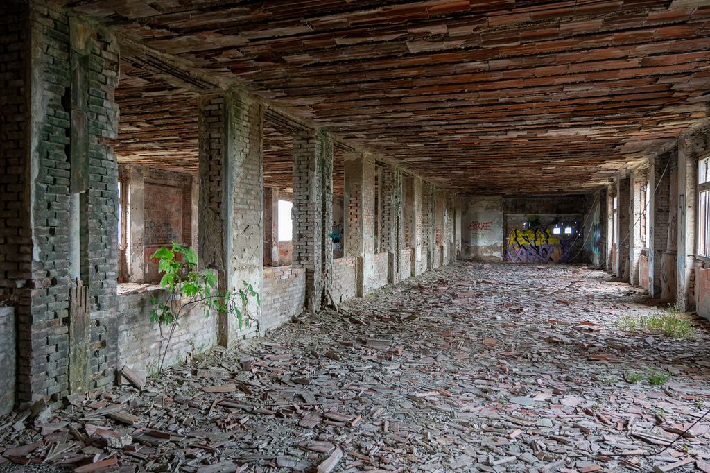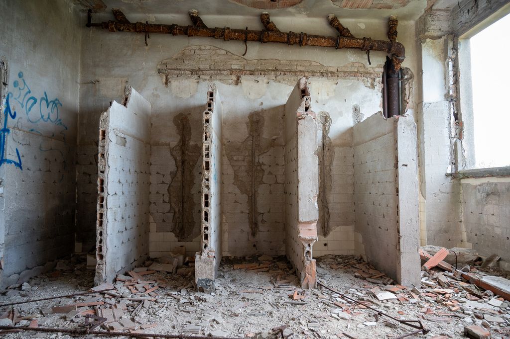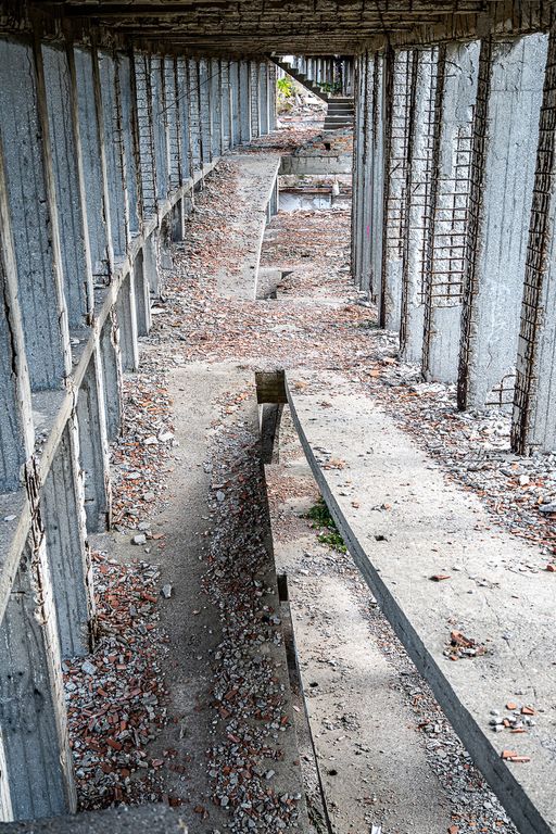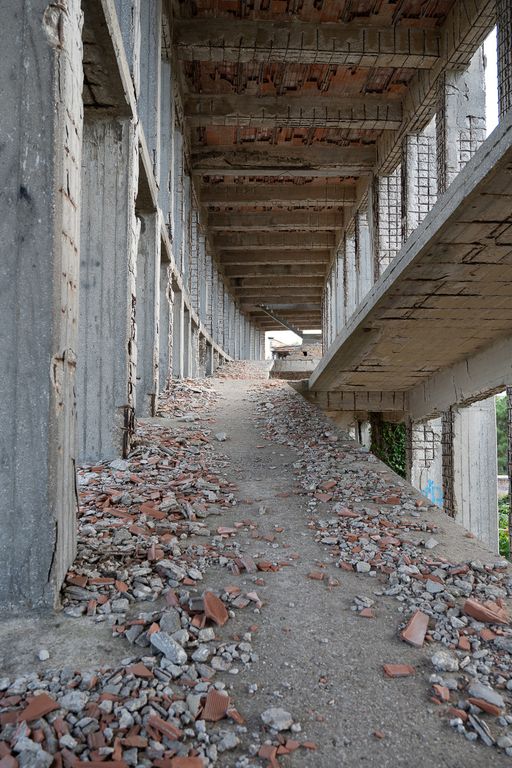 Le fotografie di Galbiati mostrano la vastità degli spazi in ossequio alla grandeur imposta dal regime, porticati e corridoi, muri crollati e il ferro del cemento armato che penzola dalle pareti divelte, uno scenario perfetto per il film horror “Zeder” che Pupi Avati girò qui nel 1983. Un deserto di cemento e mattoni dove tra i bimbi nascevano amicizie e competizioni, e tra le bimbe forse l’idea di una famiglia e dei figli, in un’Italia già segnata dalla sconfitta e dall’agonia delle bombe.