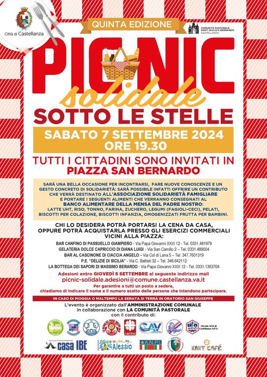 Grazie alla disponibilità delle numerose associazioni ed esercizi aderenti, l’Amministrazione Comunale, nell’ambito delle iniziative dell’Assessorato alla Gentilezza affidato alla Vice Sindaco Cristina Borroni e in collaborazione con la Comunità Pastorale Santi Giulio e Bernardo, propone anche quest’anno il pic-nic solidale di fine estate.