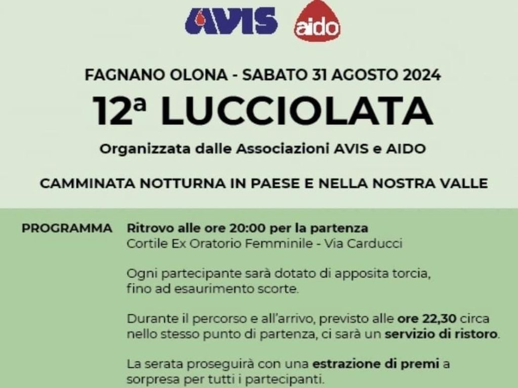 Anche quest’anno, per permettere a tutti di trascorrere in modo diverso e piacevole l’ultimo fine settimana di agosto, torna a Fagnano Olona l’appuntamento con la Lucciolata, la tradizionale camminata notturna organizzata dalle sezioni locali di Avis e Aido.