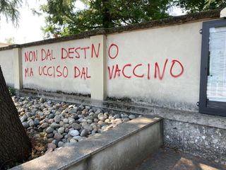 Sui muri del camposanto sono comparse le scritte «Non dal destino ma ucciso dal vaccino» e «Vax = Morte», insieme al simbolo della W cerchiata, vergati con una vernice spray rossa.