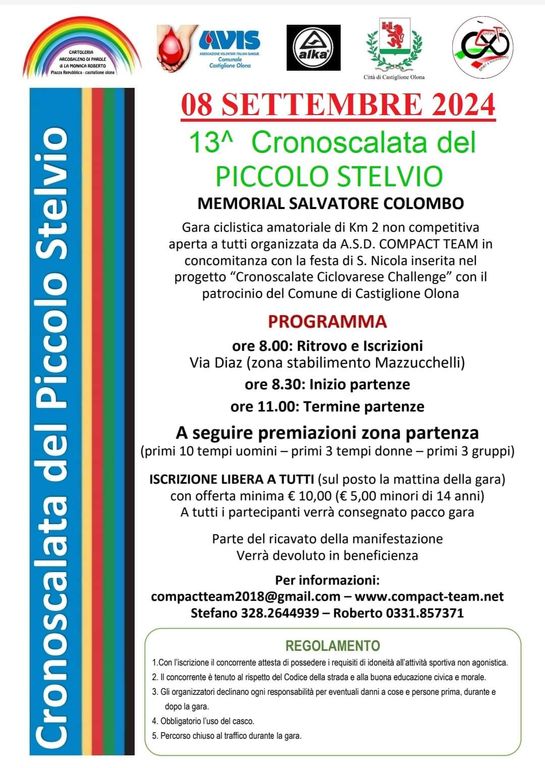 Torna, come ogni anno, domenica 8 settembre l'evento benefico della Cronoscalata del Piccolo Stelvio, giunto alla tredicesima edizione e organizzato da Asd Compact Team con il Patrocinio del Comune di Castiglione Olona e in collaborazione con Avis e Gruppo Alpini.