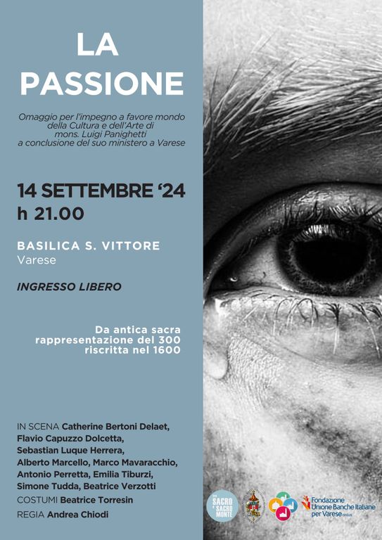 Sabato 14 settembre, alle ore 21, nella Basilica di San Vittore a Varese arriva “La Passione”, tratto da antica sacra rappresentazione del 300 riscritta nel 1600, omaggio per l’impegno a favore del mondo della Cultura e dell’Arte di mons. Luigi Panighetti.