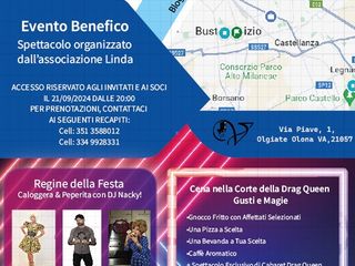 L’Associazione Culturale Linda di Busto Arsizio ha deciso di aiutare Ananke Family nella sua missione, organizzando una serata benefica che si terrà sabato 21 settembre. Si tratta di una cena al Ristorante Giuseppe Verdi, ad Olgiate Olona (via Piave 1), seguita da uno spettacolo drag queen.