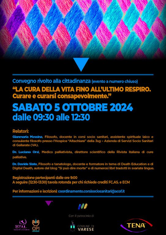 Il corso si aprirà dunque sabato 5 ottobre a Varese con un convegno aperto anche alla cittadinanza, proprio con lo scopo di avvicinare tutti a un argomento sensibile. Dalle 9.30 alle 12.30 si parlerà così di “Cura della vita fino all’ultimo respiro: curare e curarsi consapevolmente”. Ciò avverrà attraverso gli interventi dello stesso Messina, di Luciano Orsi (medico e direttore della Rivista Italiana di cure palliative) e di Davide Sisto (filosofo, tanatologo, docente universitario e scrittore). A seguire ci saranno una tavola rotonda e i test per il riconoscimento dei crediti Fc.As. per gli assistenti sociali ed ECM per le professioni sanitarie.