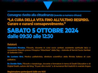 Il corso si aprirà dunque sabato 5 ottobre a Varese con un convegno aperto anche alla cittadinanza, proprio con lo scopo di avvicinare tutti a un argomento sensibile. Dalle 9.30 alle 12.30 si parlerà così di “Cura della vita fino all’ultimo respiro: curare e curarsi consapevolmente”. Ciò avverrà attraverso gli interventi dello stesso Messina, di Luciano Orsi (medico e direttore della Rivista Italiana di cure palliative) e di Davide Sisto (filosofo, tanatologo, docente universitario e scrittore). A seguire ci saranno una tavola rotonda e i test per il riconoscimento dei crediti Fc.As. per gli assistenti sociali ed ECM per le professioni sanitarie.
