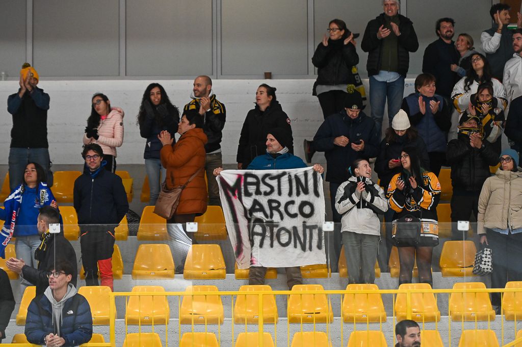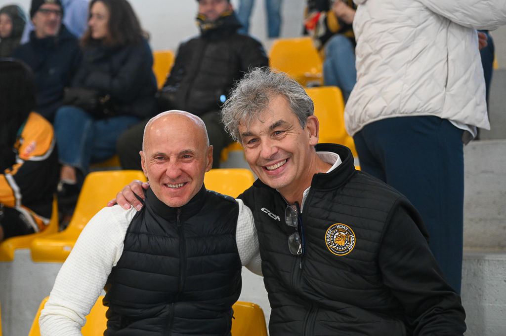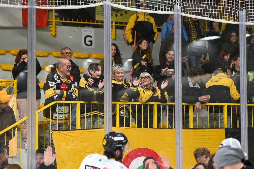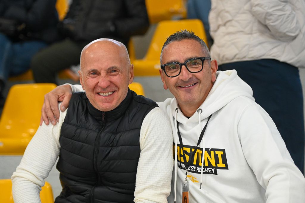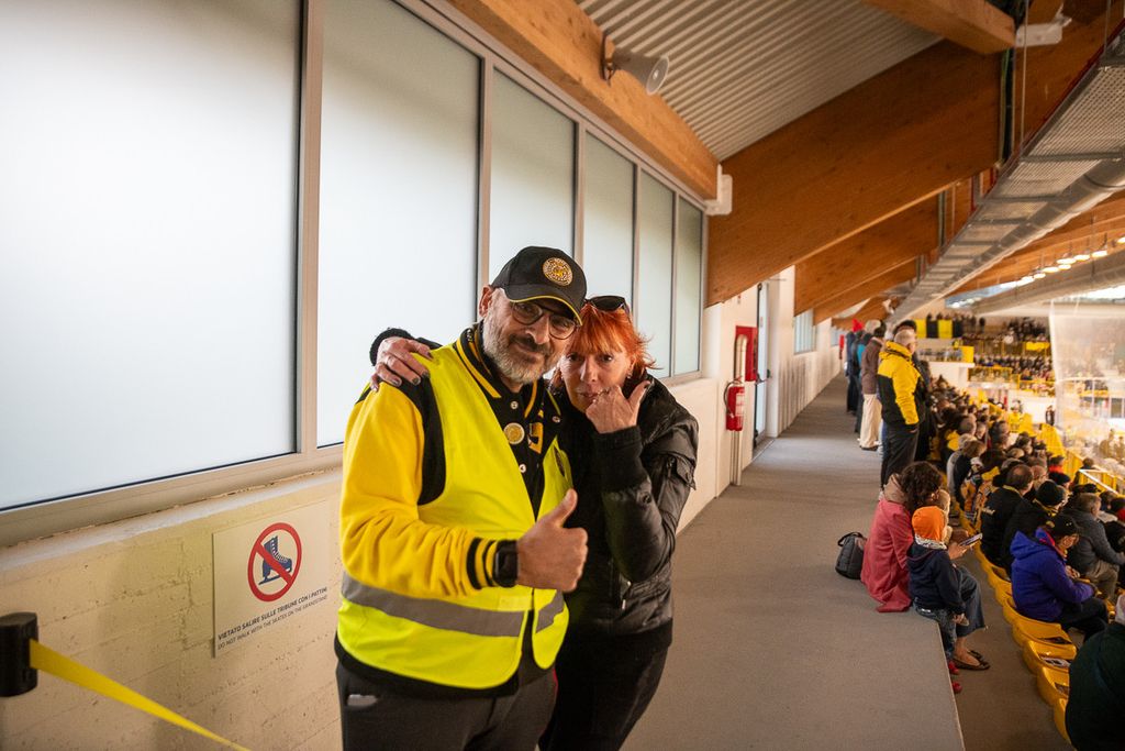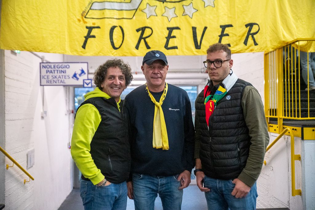 Hanno rubato i cuori, oltre che gli occhi, anche lo spettatore d'eccezione Cesare Carlacci - oggi sessantaquattrenne, per sempre eroe degli scudetti e della leggenda giallonera (nessuno ha segnato i suoi 527 punti con 251 gol e 276 assist, davanti a Micheletti, a quota 271, e Denis Houle con 255: leggi QUI) - così come il solito grande pubblico di via Albani. Novecento spettatori, che a colpo d'occhio sembravano perfino di più, ripresi dagli scatti di Alessandro Umberto Galbiati, in cui c'è anche un giovane tifoso del Fassa con striscione per i Falcons e un altro con un cartello per Marco Matonti.