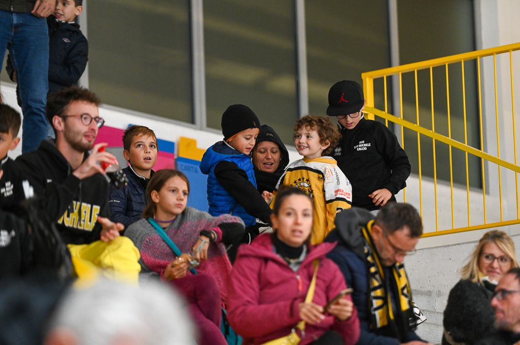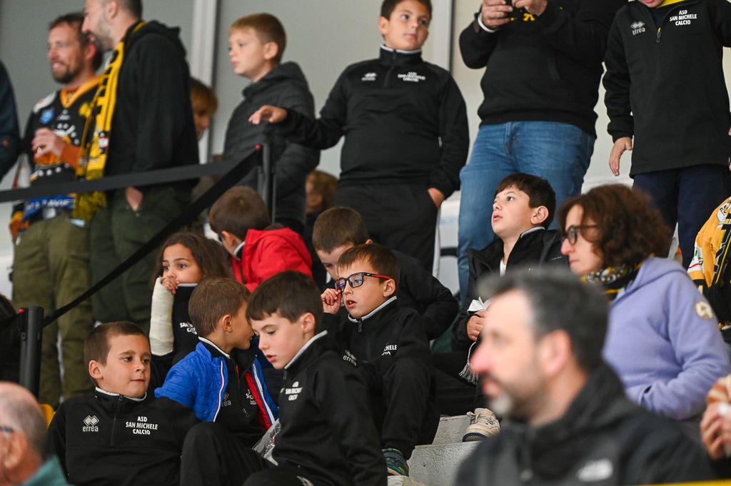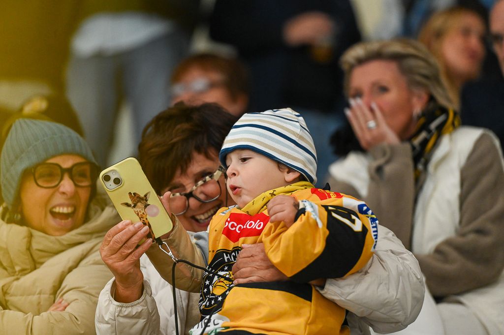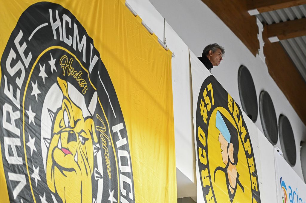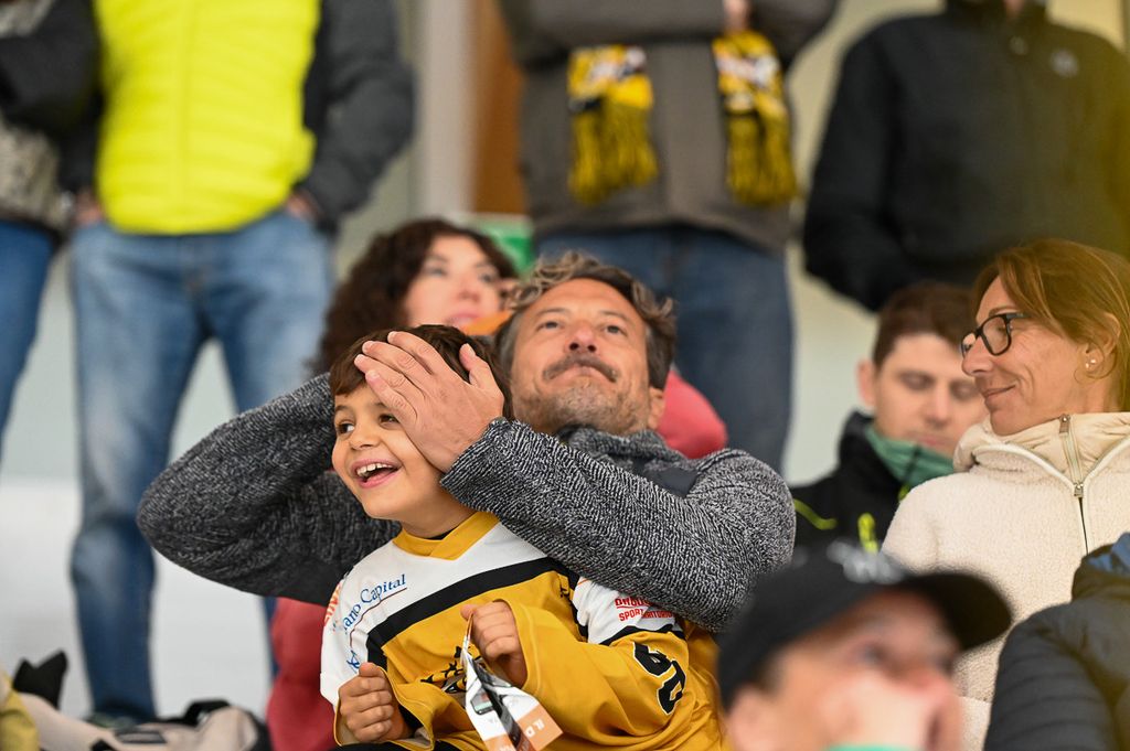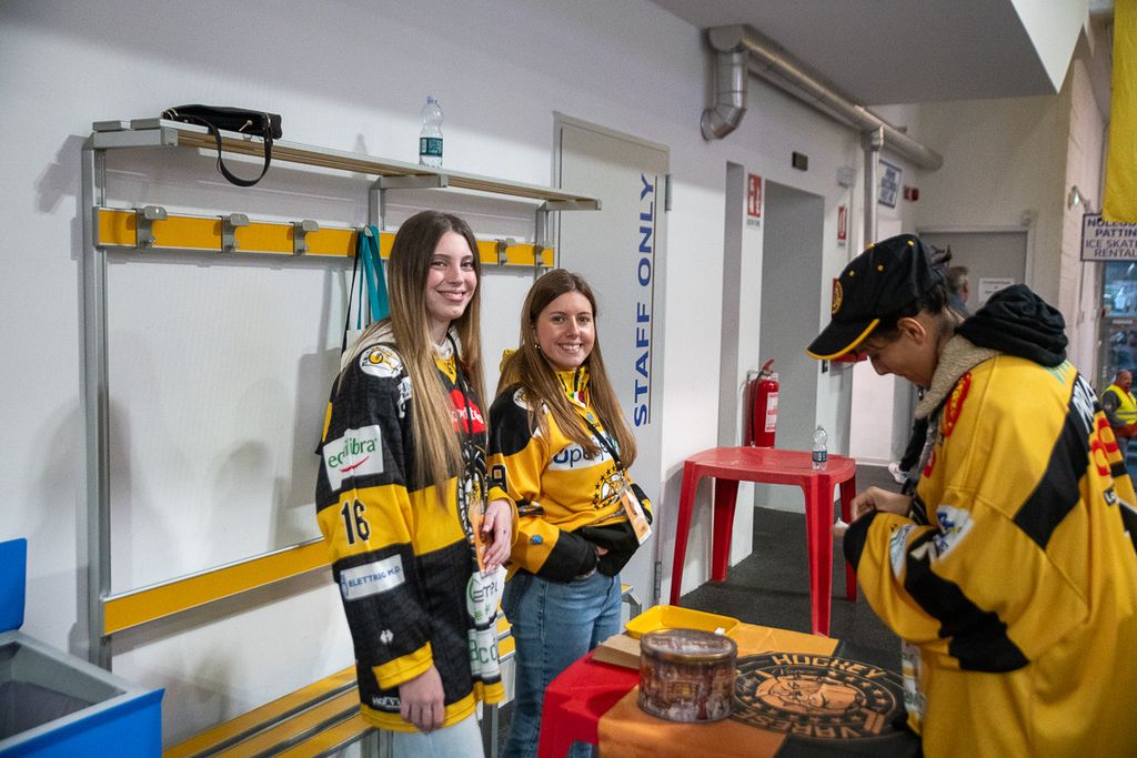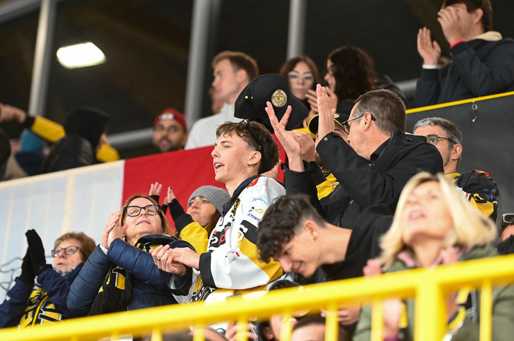 Hanno rubato i cuori, oltre che gli occhi, anche lo spettatore d'eccezione Cesare Carlacci - oggi sessantaquattrenne, per sempre eroe degli scudetti e della leggenda giallonera (nessuno ha segnato i suoi 527 punti con 251 gol e 276 assist, davanti a Micheletti, a quota 271, e Denis Houle con 255: leggi QUI) - così come il solito grande pubblico di via Albani. Novecento spettatori, che a colpo d'occhio sembravano perfino di più, ripresi dagli scatti di Alessandro Umberto Galbiati, in cui c'è anche un giovane tifoso del Fassa con striscione per i Falcons e un altro con un cartello per Marco Matonti.