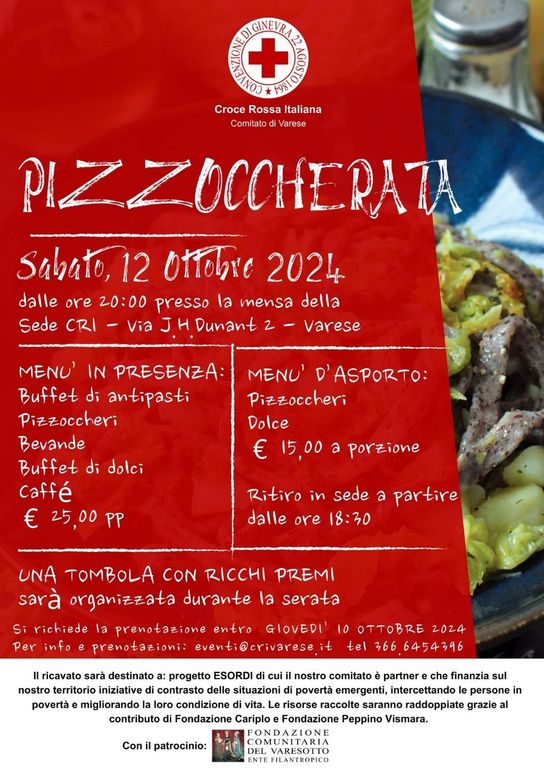 La Croce Rossa Italiana, Comitato di Varese, invita tutti a partecipare alla tradizionale Pizzoccherata, che si terrà sabato 12 ottobre 2024 presso la mensa della sede CRI, in via J.H. Dunant 2, Varese. Una serata all'insegna della convivialità e della solidarietà, con un ricco menù e l'immancabile tombola con ricchi premi.