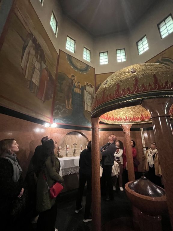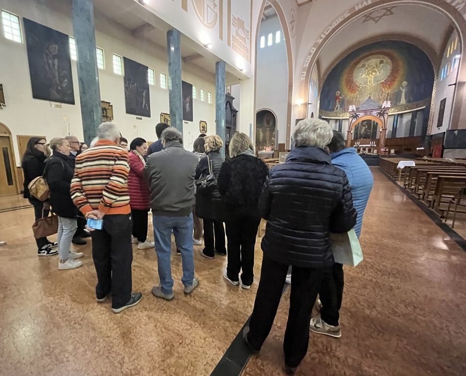 Poi tutti in chiesa a scoprire ogni dettaglio, dal disegno e dai rivestimenti dell'esterno all'altare con il ciborio e ai segnali di modernità come il sacerdote che si rivolgeva già ai fedeli non dando le spalle, le tele della Via Crucis, il battistero e naturalmente la statua di Sant'Edoardo.