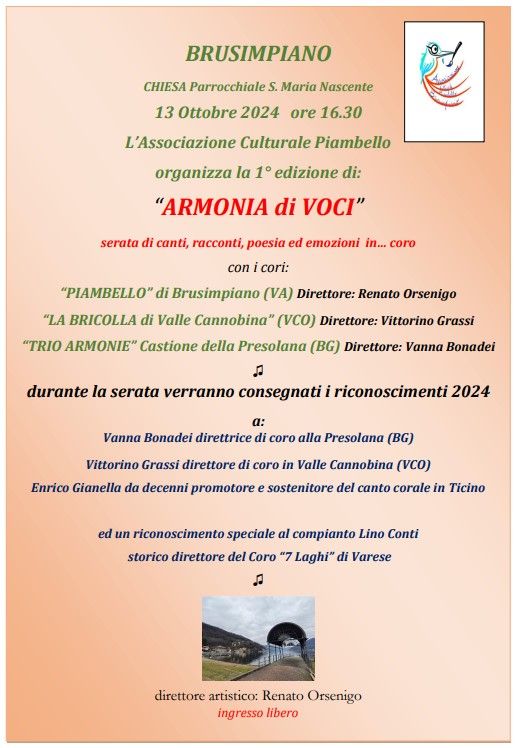 All’incontro, organizzato dall’Associazione Culturale del Piambello, parteciperanno il coro Piambello di Brusimpiano (diretto da Renato Orsenigo, che è anche direttore artistico dell’evento), il coro La Briccola di Valle Canobbina (diretto da Vittorino Grassi) e il coro Trio Armonie di Castione della Presolana (diretto da Vanna Bonadei).