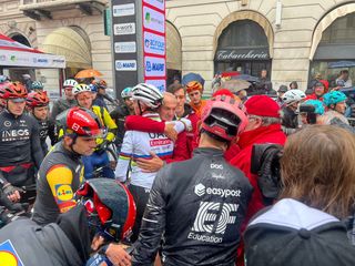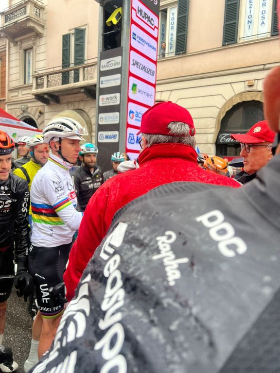 14.14 Ecco Renzo Oldani a colloquio con i corridori che si sono fermati in via Sacco. La Tre Valli è sospesa: l'abbraccio tra il patron della Binda e il campione del mondo Pogacar