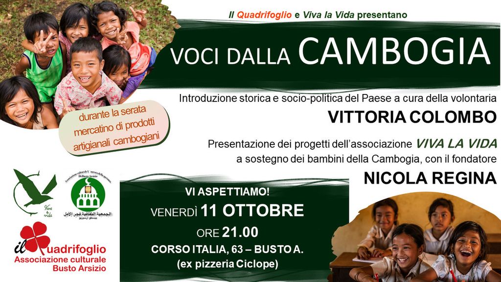Venerdì 11 ottobre, alle 21, all'Associazione Aurora della Speranza (corso Italia 63, nei locali che furono de “Il ciclope”) direttamente dalla Cambogia interverrà Nicola Regina, fondatore di Viva la Vida, organismo di volontariato internazionale che da anni opera nelle realtà più emarginate della società cambogiana, al servizio dei più deboli: i bambini. Ad aprire l'incontro Vittoria Colombo, volontaria di Busto Arsizio, che presenterà l'universo socio-politico della Cambogia contemporanea.