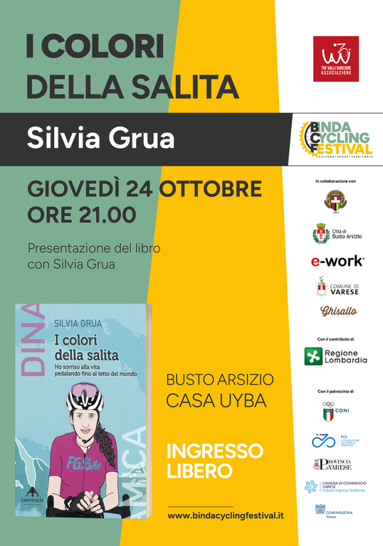 L’ultimo appuntamento è in programma questo giovedì 24 ottobre alle ore 21 presso Casa Uyba a Busto Arsizio (ingresso da via Ottorino Maderna) e sarà dedicato alla presentazione del libro “I colori della salita” di Silvia Grua.