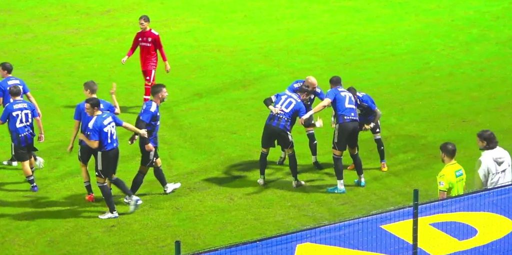 L'urlo di Torraca dopo la doppietta fa alzare in piedi il Chinetti. Sotto i giocatori della Solbia "giocano" dopo l'1-0 dell'attaccante nerazzurro