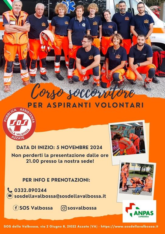 La presentazione del nuovo Corso per Soccorritore, promosso e realizzato da SOS della Valbossa, si terrà martedì 5 novembre alle ore 21.00, presso la sede in Via 2 Giugno. Per l’occasione, si farà riferimento all’intervento sia urgente, sia non urgente con l’obiettivo di illustrare le tecniche e le competenze necessarie per prestare soccorso in caso di necessità.