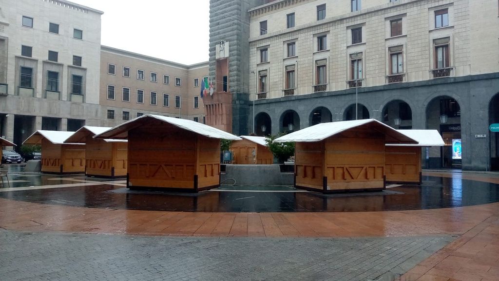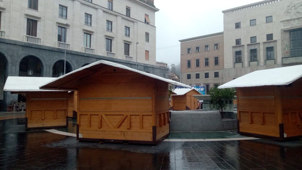 Le casette in legno sono già state montate e sono, quindi, pronte per ospitare i venditori e ricreare un tipico villaggio alpino.