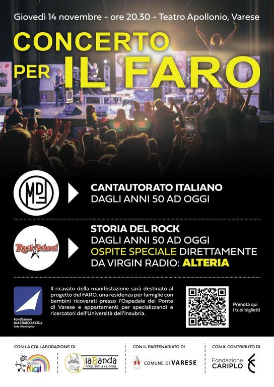 Sul palco Mdf e Rock School per concentrare in un’unica serata la magia dei grandi cantautori italiani e l’energia dei classici del rock. Tutti uniti in un crescendo di emozioni a sostegno del Faro, un approdo sicuro per chi si prende cura dei bambini dell’Oncoematologia pediatrica di Varese, che Fondazione Giacomo Ascoli sta realizzando in Largo Flaiano.