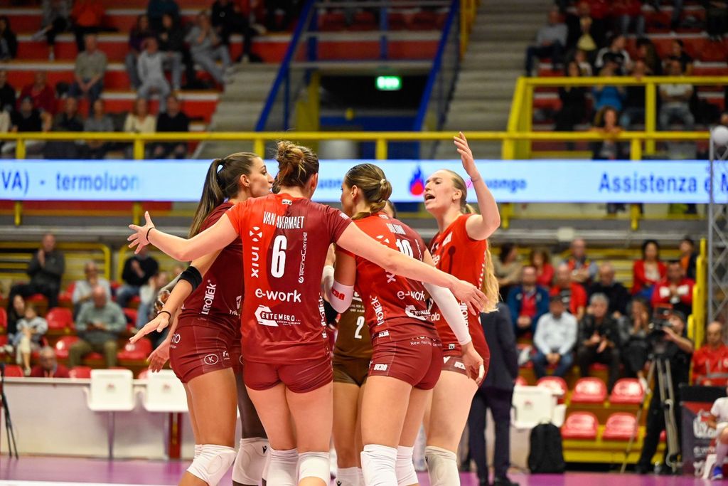 Tie-break. Barbolini si riaffida al sestetto titolare con Boldini e Obossa in campo. Primo break biancorosso (4-2, Akrari out). Van Avermaet allunga (5-2). Il servizio di Obossa, che oggi non si era ancora visto, si mostra nel momento decisivo del match (7-2). Boldini e Van Avermaet ci mettibi le mani a muro (si cambia campo sull'8-2). Piva e Kunzler sono una sentenza (di gran lunga le migliori in campo e le più continue nel corso del match). 11-4 che diventa presto 15-8 (chiude Piva, Mvp). Applausi e sorrisi (tanti), in campo e fuori.