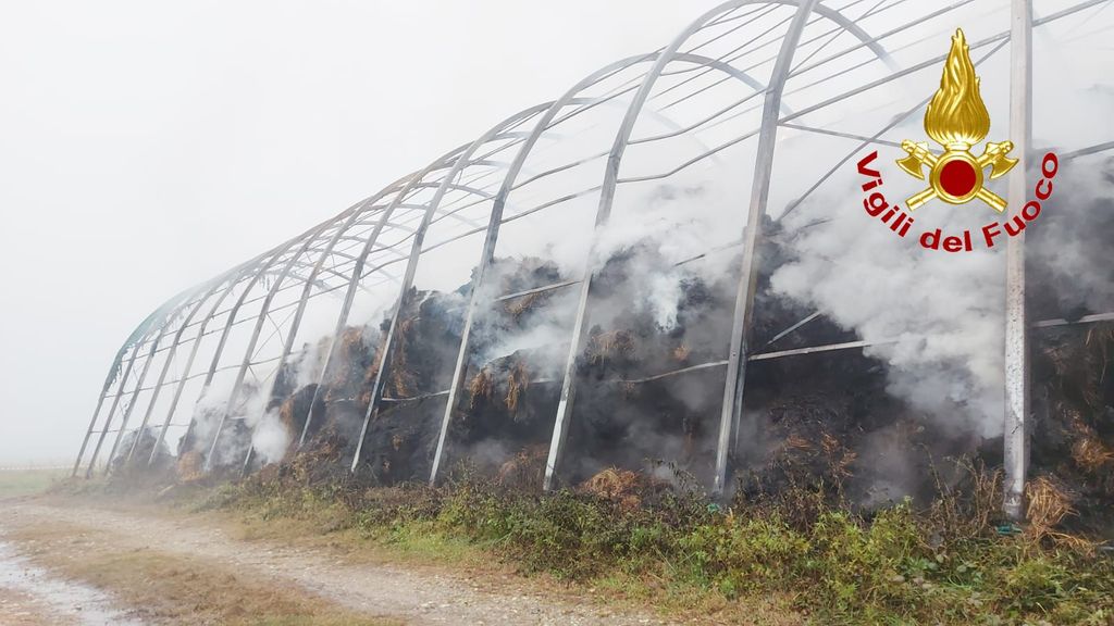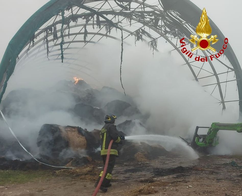 Incendio in un'area agricola: tensostruttura distrutta dalle fiamme non lontano dalla pista ciclabile. I vigili del fuoco al lavoro da ore per contenere il rogo. Il sindaco: «Nessun pericolo, ma tenete chiuse le finestre»