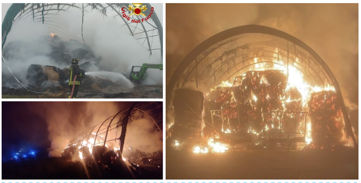 Incendio in un'area agricola: tensostruttura distrutta dalle fiamme non lontano dalla pista ciclabile. I vigili del fuoco al lavoro da ore per contenere il rogo. Il sindaco: «Nessun pericolo, ma tenete chiuse le finestre»