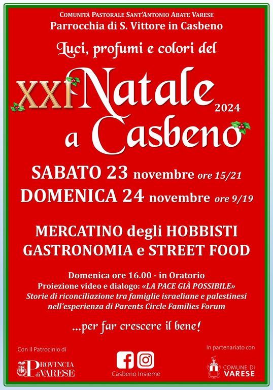Torna anche quest'anno l'appuntamento con il Mercatino di Natale di Casbeno. L'appuntamento è per il prossimo fine settimana, quello di sabato 23 e domenica 24 novembre. Si tratta della ventunesima edizione di un evento di magica atmosfera pensato «per far crescere il bene!», come sottolineano gli organizzatori. L'evento riempierà il vivace rione varesino con un mercatino degli hobbisti e delle associazioni , Gastronomia, Golosità, Mostra Fotografica, Cantastorie, Mini-Fiaccolata, Animazione per bambini, Incontro e confronto sul tema della Pace.