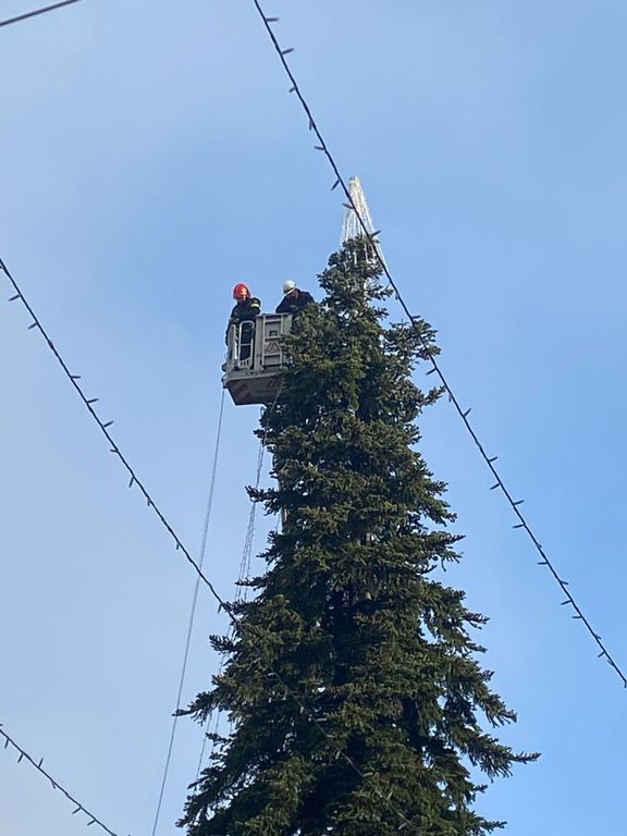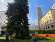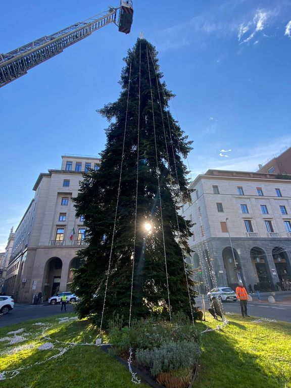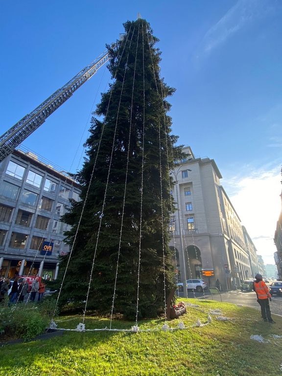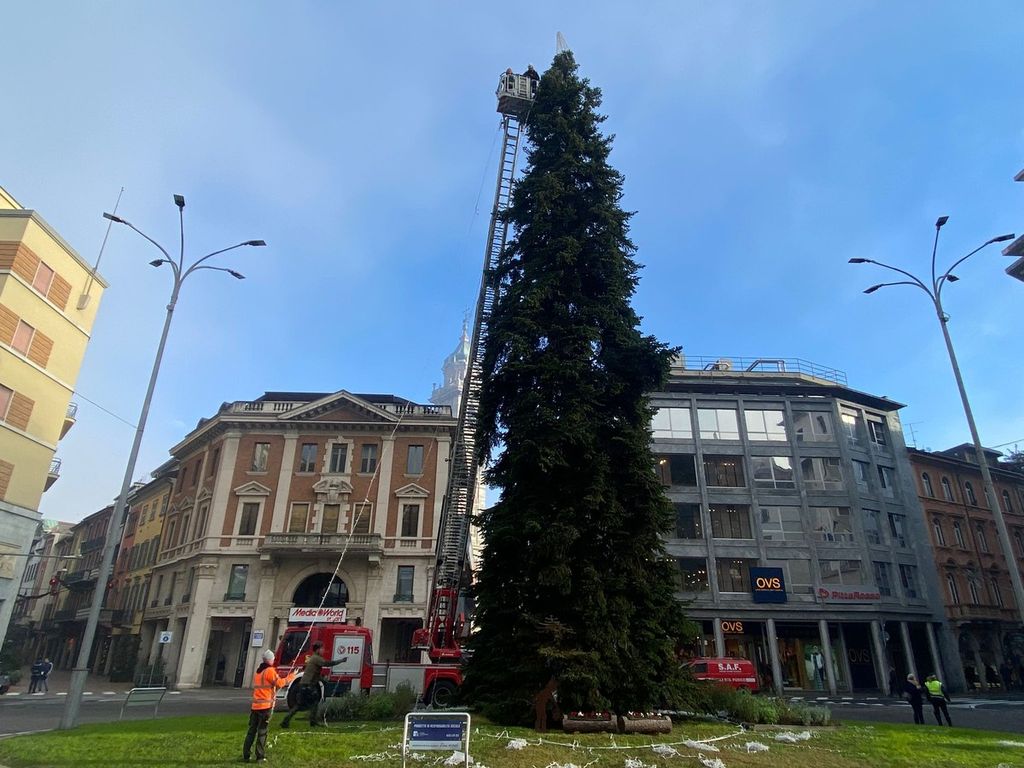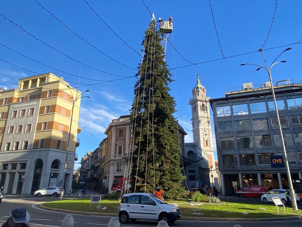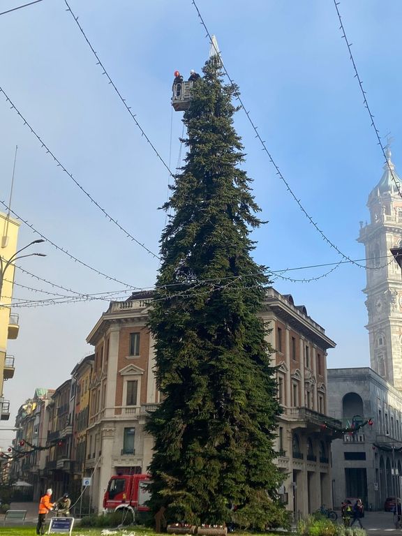 È iniziato in una fredda mattinata di novembre l'allestimento dell'albero di Natale in piazza Monte Grappa, con la gru e i vigili del fuoco in azione per posizionare le luci e la punta dell'abete che, dall'alto, dominerà le feste dei varesini, tra il campanile di San Vittore e la Torre Civica.