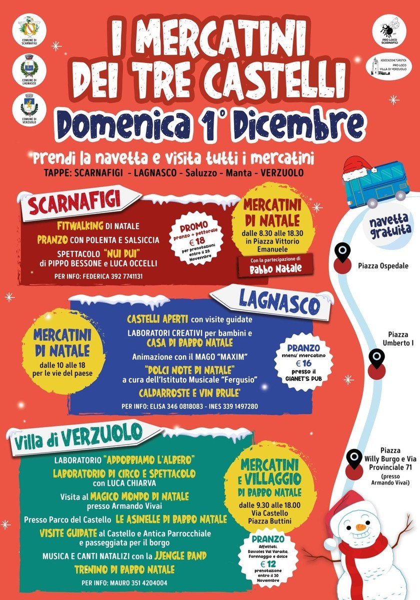 Un' occasione per entrare nell'atmosfera natalizia, apprezzando le diverse iniziative, rivolte a grandi e piccini, proposte dai Comuni coinvolti. Una navetta gratuita collegherà tutti i mercatini, con tappe a Scarnafigi, Lagnasco, Saluzzo, Manta e Verzuolo.