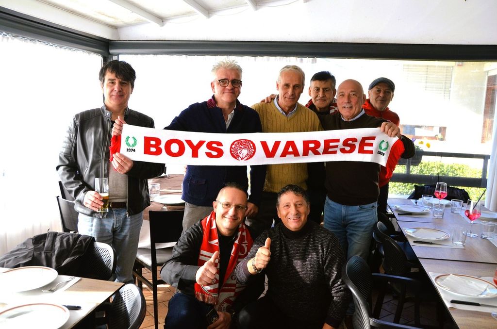 Alla pizzata benefica del Volo a Vela per sostenere anche economicamente l'attaccante della promozione biancorossa in C1 del 1990 che lotta contro la malattia presenti in mezzo ai tifosi Claudio Milanese, oggi patron della Solbiatese, una rappresentanza del Città di Varese e una settantina di storici amici dal cuore biancorosso. La sciarpa del 50° dei Boys per l'amatissima punta toscana di Prato. Le foto di Ezio Macchi