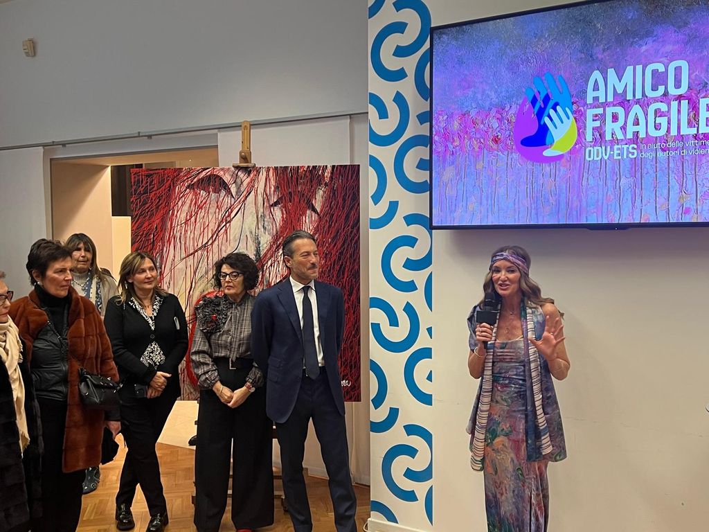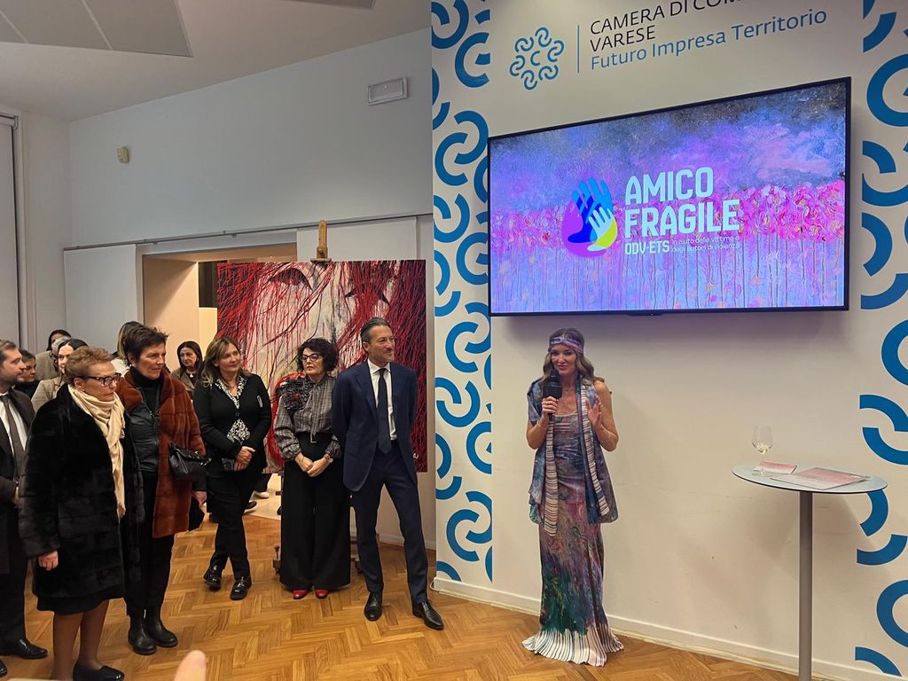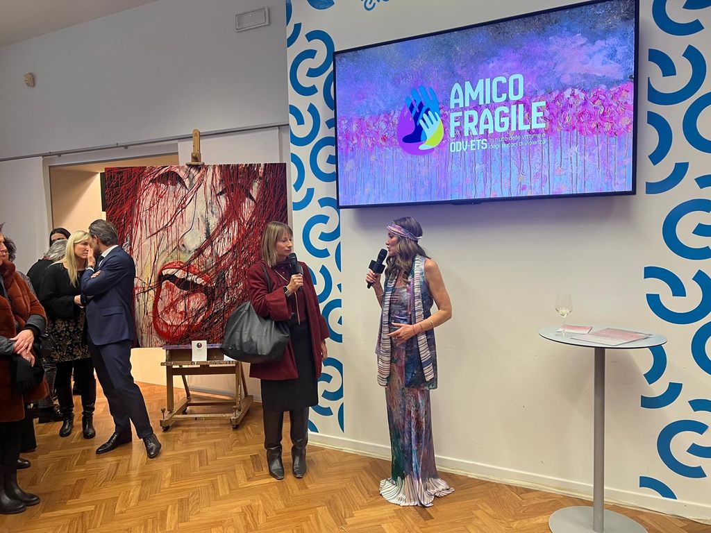 Vicino a lei il collega artista Oliviero Passera e l’equipe di Amico Fragile OdV-ETS, l’associazione di volontariato varesina che si dedica instancabilmente all’assistenza socio-sanitaria e alla tutela dei diritti delle persone vittime di abusi.