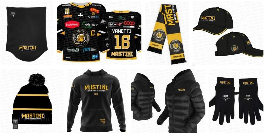 Grazie alla Primato Sport di Montano Lucino, specializzata e leader nelle linee di abbigliamento sportivo, è infatti possibile scegliere online uno dei capi gialloneri per sé o per chi ama i Mastini: si va dalle maglie di gara ufficiali griffate dal nome del giocatore preferito, da segnalare nell'apposito spazio al momento dell'ordine, al cappellino con visiera e alla sciarpa, dal berretto invernale allo scaldacollo e ai guanti, dalla felpa con una parola sul petto che scalda il cuore come "Mastini" alla t-shirt e al giaccone invernale.