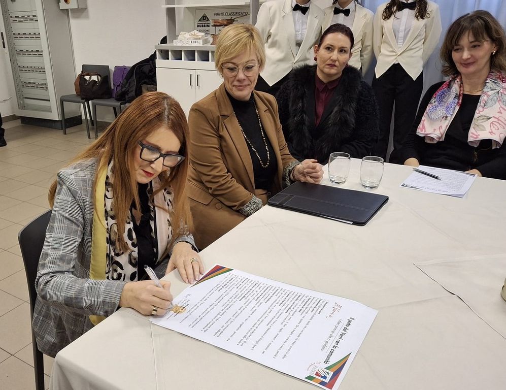 La ripartenza, all’Ipc Verri, c’è stata. E dopo un lungo periodo di polemiche, disagi, incomprensioni, coinvolgimento di istituzioni esterne al “pianeta istruzione”, anche messaggi anonimi e veleni (vedi l’articolo e le news collegate QUI) c’è la voglia di comunicare che nelle aule si lavora con il consueto impegno, che la formazione garantita agli iscritti è di ottimo livello e che l’Istituto è pronto ad accogliere le famiglie e gli studenti di domani, in prospettiva anno scolastico 2025-26. Sul nuovo inizio mette letteralmente la firma la nuova dirigente, Maria Cristina Cesarano. Questa mattina, presentando gli ormai prossimi open day, ha siglato un decalogo, il patto del Verri con la comunità. Lincipit del documento: "Il Verri è…" (file in fondo all’articolo). Seguono principi quali inclusione, benessere, valorizzazione dei talenti, intercultura, innovazione, connessioni, esperienze, creatività. Il punto nove è “Persone, non ruoli”. «Ognuno – si legge – è parte essenziale di un tutto. Valorizziamo storie, competenze e impegno quotidiano per una scuola che cresce insieme». Alla presentazione assistono, impegnati sul campo, studenti dell’indirizzo in Servizi per l’enogastronomia e l’ospitalità alberghiera. Gli insegnanti, con i quali il patto è stato messo a punto, esprimono la loro approvazione. La dirigente sottoscrive e, ribadita la volontà di guardare al futuro e di volare alto, conclude: «Sono orgogliosa di essere qui».