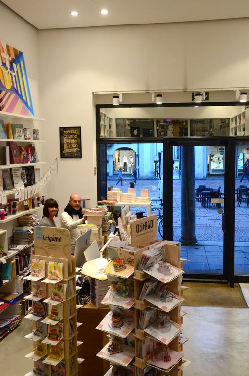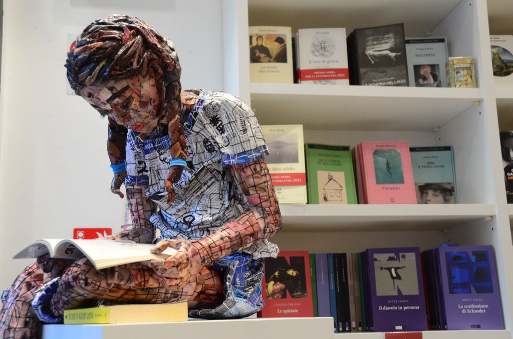 Una bambina con le trecce siede assorta con un libro in mano, la sua pelle è fatta di sorrisi e occhi indagatori, la maglietta riporta ritagli di giornale e note musicali, tutto un mondo di carta che ci è appartenuto e ora mostra la sua anima, tutt’uno con quella della lettrice. La scultura dell’artista svizzera Manuela Granziol accoglie i clienti della Libreria Ubik di piazza del Podestà, un benvenuto augurale per un negozio quasi un salotto buono, con i librai Cristina, Luca, Luisa e Clara grandi lettori e perfetti consiglieri per gli acquisti, come usava un tempo, prima che le major dell’editoria monopolizzassero il mercato librario con negozi spesso anonimi.