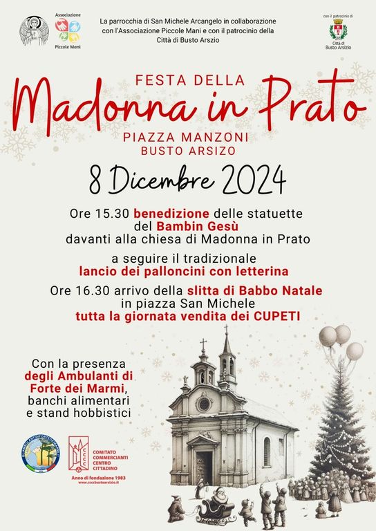 Anche quest’anno, in occasione della festa dell’Immacolata, la Parrocchia di San Michele, in collaborazione con l’Associazione Piccole Mani – attiva all’interno della scuola materna parrocchiale – ha organizzato la tradizionale festa della Madonna in Prato. L’evento, patrocinato dall’Amministrazione Comunale, vede il contributo del Comitato dei Commercianti del Centro Cittadino e coinvolge la comunità in un’atmosfera di festa e solidarietà.