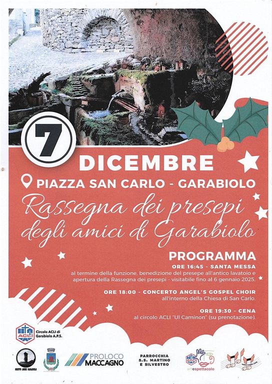 Sabato 7 dicembre: - ore 17.30 - apertura ufficiale della “Rassegna di Presepi” all’antico lavatoio, in Via Lago Delio; -ore 18.00 - in chiesa, concerto degli Angel’s Gospel Choir, diretto da Yasmine Zekri.