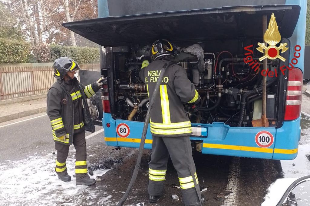 FOTO. Pullman prende fuoco a Binago, l'autista spegne le fiamme in tempo